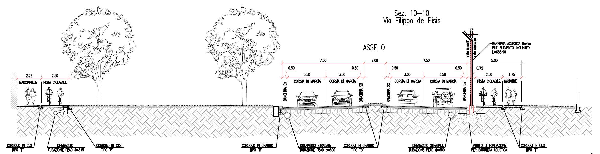 Questa struttura risulta in sintonia con l’attuale standard del Comune per quanto attiene le nuove strade di tipo interquartiere (una strada – si specifica – “che interscambi con la maglia stradale di quartiere e sia percorsa a velocità ridotta”).